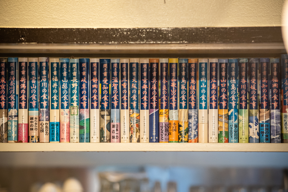 郷土料理や日常のごはんが記された書籍が並ぶ。古書店で買い集めたり、閉館した図書館から譲り受けたものだそう