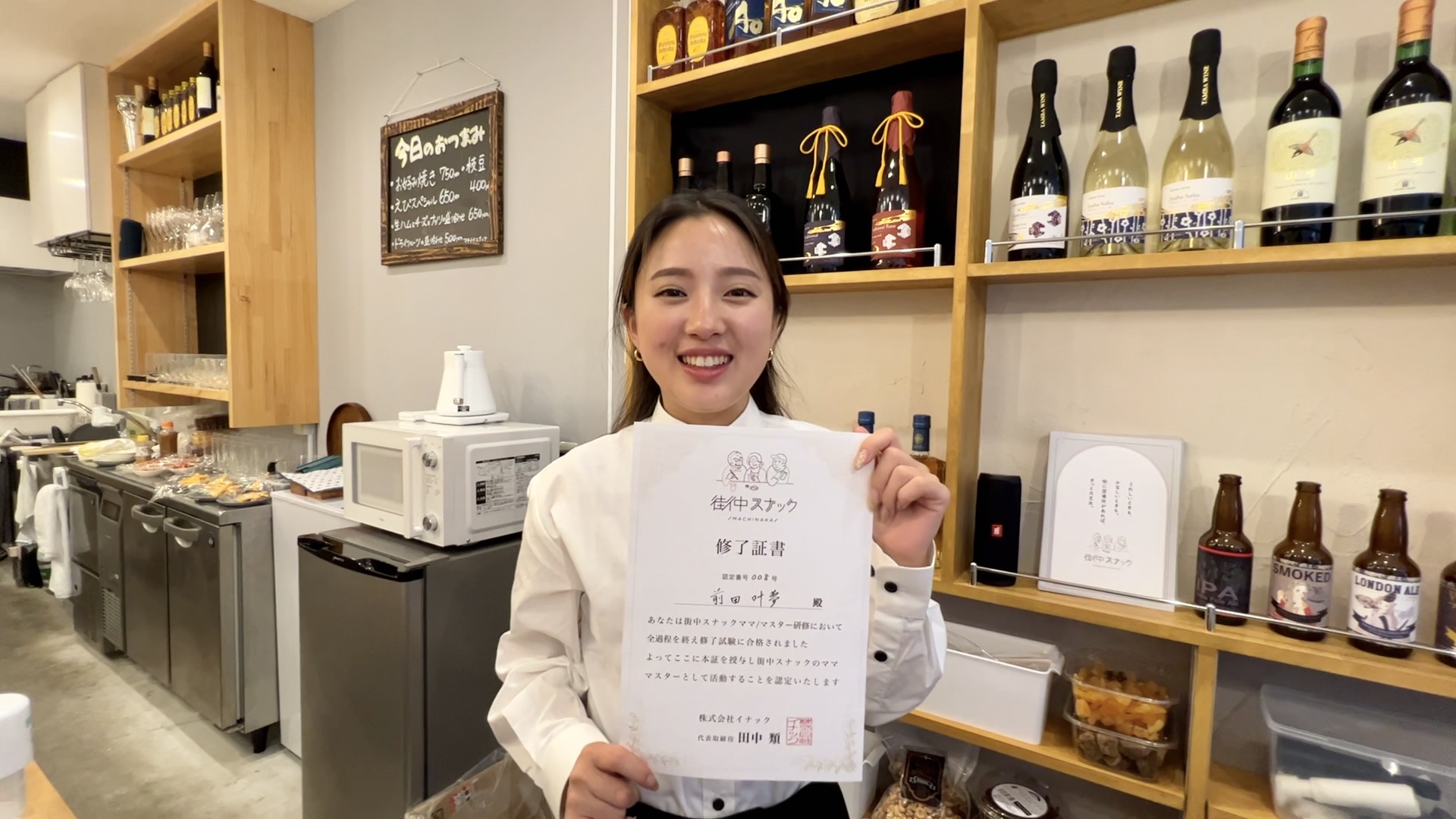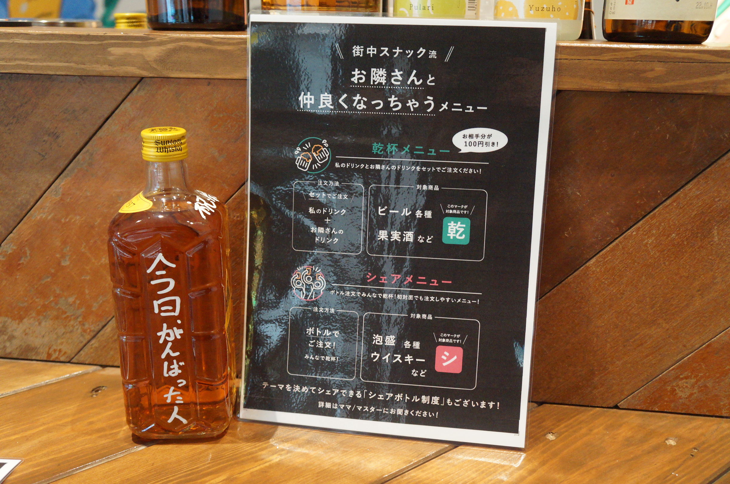 「ママ・マスターとなるのは、〈街中スナック〉独自の研修を受けた20代の若い世代。この世代がお店に立つことでスナックに馴染みのない世代でも入りやすくなるでしょうし、なにせシニア世代も若い人たちと話すのが好き。頑張っている若い世代を応援してくれるんです。こうした異世代のコミュニケーションを学んだママ・マスターが媒介者となってつなぎますし、メニューもひと工夫。その場に居合わせた隣の人に1杯おごることでドリンクが100円引きになる『乾杯メニュー』や、1日頑張った人など自ら決めたテーマに合ったお客さんに1杯ドリンクをご馳走する『シェアボトル』などと、世代が違っても楽しく交流できる仕組みを作っています」