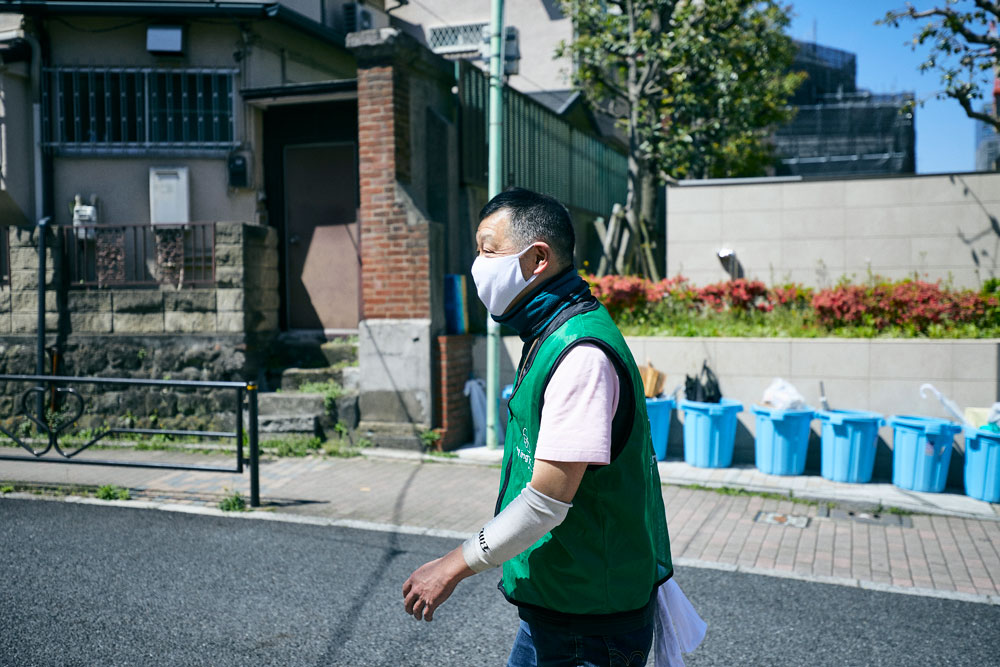 活動用の緑色のベストを着て、学生のもとへ歩く長谷川さん。