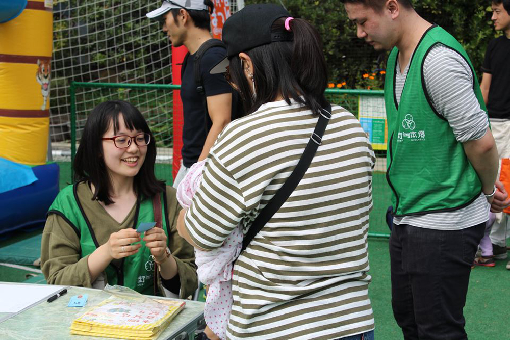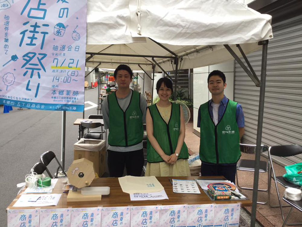 「本郷商店街祭り」にて福引ブースの受付を担当した学生メンバーたち。