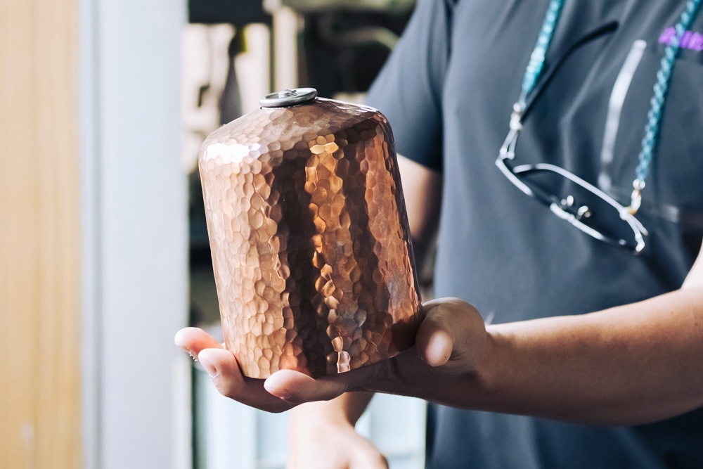 銅製のガスカートリッジジャケット。職人が1つ1つ叩いて施した美しい槌目が魅力的