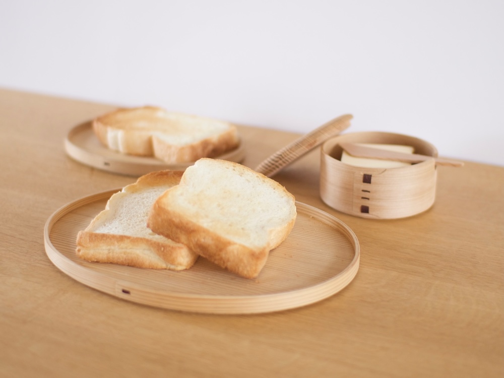 「カタログなどグラフィックデザインを担当することになっていたんですけど、もともと建築を学んでいたこともあって、平面のその先ばかりが気になってしまって。プロダクトのデザインをどうしてもやりたくて、自分なら曲げわっぱで何を作るかを考え、段ボールや紙で模型を作って工房まで持っていったんです。だけど、実際に曲げわっぱを手にし、社長や職人さんたちと話していたら、僕が持ってきた模型は全く成立するものではなかった。その時に、曲げわっぱの材料になる秋田杉は蒸気を適度に吸い、抗菌作用があることを教わったんです。それで曲げわっぱのおひつの蓋をひっくり返して使えば、パン皿にも応用できるのではと思って、その場で提案しました」