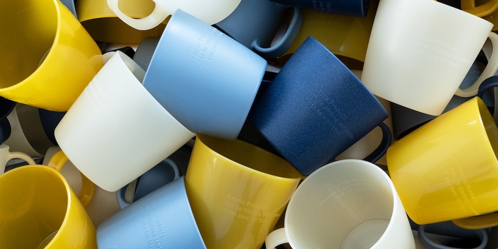 この展覧会をきっかけに、眞田さんはナガオカさんが行っていたクラウドファンディングに法人枠で寄付。これが縁となり、ナガオカさんと一緒にプラスチックを一生ものとして考える「Long Life Plastic Project(ロングライフ プラスチック プロジェクト)」をスタートします。そこでプラスチック製品の金型メーカーやプラスチック原料を供給する企業と協力しながら作り始めたのが、軽くて割れにくいプラスチックの素材を生かしたマグカップ。2年ごとに色を変え、4色のマグカップを個数限定で販売しています。