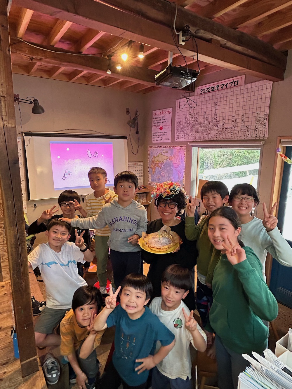 上/〈マナビノキ〉は鎌倉の浄明寺エリアに。末原さんやスタッフさんが手を動かし、元々八百屋だった古民家をアフタースクールとして再生させた 下/子どもたちが末原さんの誕生日をお祝いしてくれた時の1枚。末原さんは子どもたちから「エミ」と呼ばれ、親しまれている