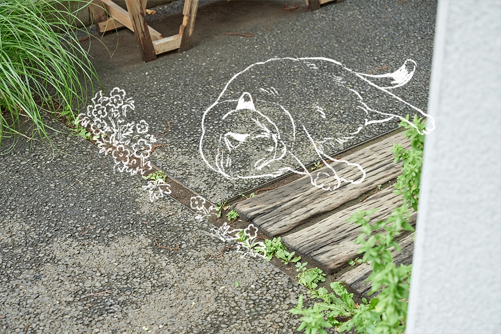 また、新たにパーゴラ(*1)を設け、緑豊かな庭を屋内と屋外の中間領域にして、建物から通路へのグラデーションをなめらかにしています。他にも、室内床と外構に同じ板材や仕上げを採用することで、内外に連続性を持たせるといった工夫をしています。