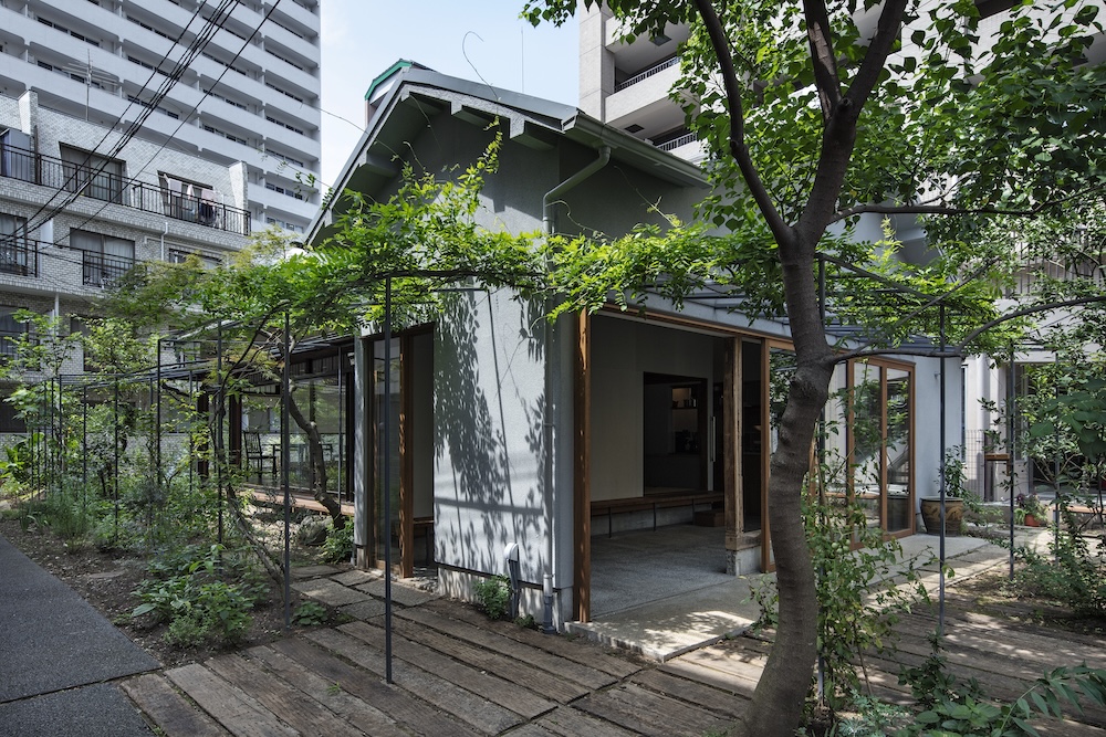 前庭や通路との間にパーゴラを設けて、植物を這わせることで、屋内と屋外をゆるやかにつなぐ中間領域に。(写真:Kenta Hasegawa)