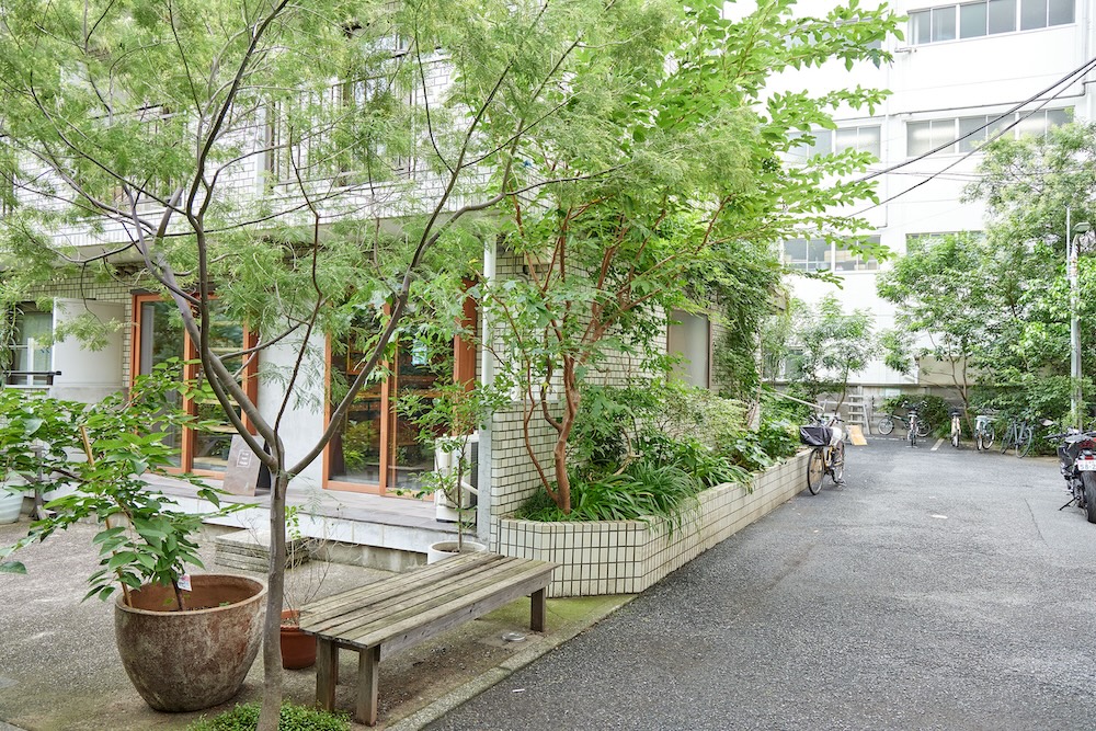 集合住宅〈コーポ紫雲〉の1階には器のお店〈うつわbase FUURO〉を誘致。池袋駅から徒歩5分という立地ながら、窓からは豊かな緑が望める。