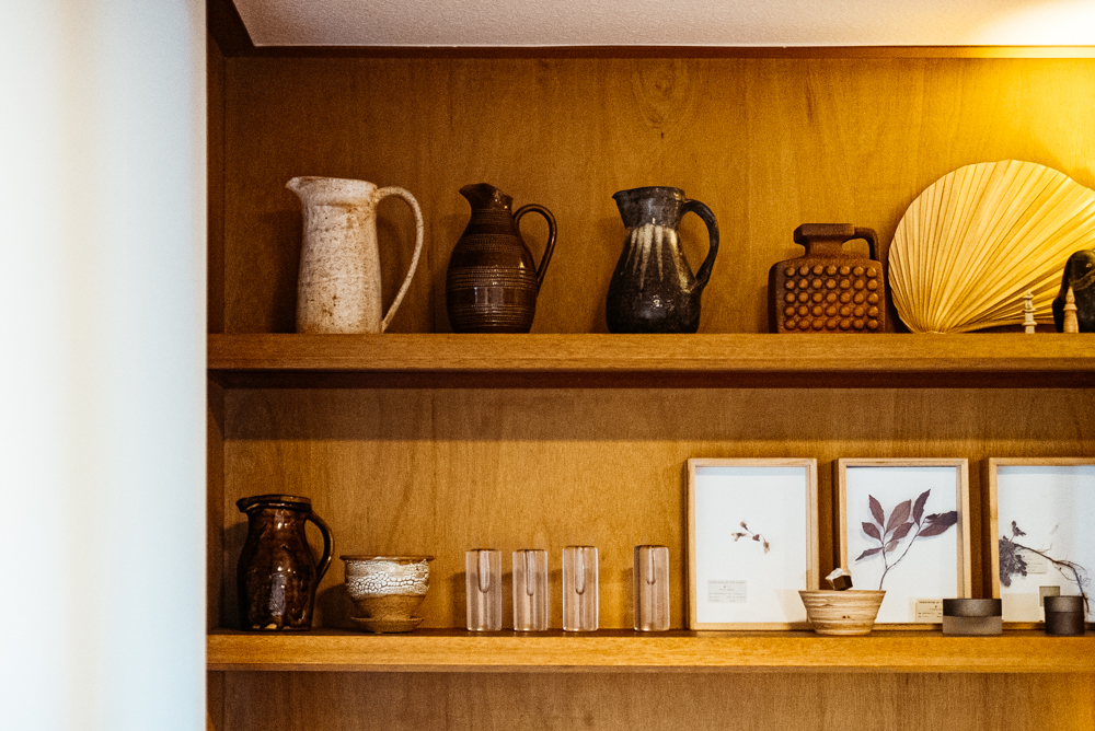 建築家フランク・ロイド・ライトの考え方をモチーフにし、磯矢亮介氏が設計したという鞍田さんのご自宅。壁面には工芸品が並ぶ