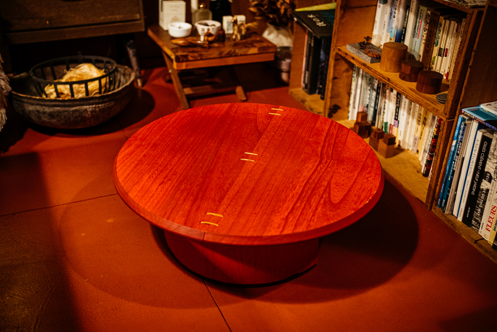 福島県会津若松市の関美工堂の企画で、家具職人と漆塗り師が手がけたちゃぶ台「NODATE chabu」。畳むことができ、持ち運びできるから、アウトドア家具としても人気だそう