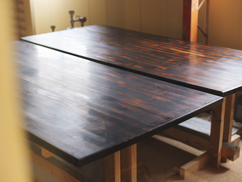 蒔絵工房ではクラウドファンディングのリターンの1つ、倉庫の廃材を使った漆のテーブルを製作中。漆を固めるのに最適な温度と湿度に保ち、左右の工房からゴミが入らないよう空調も管理している