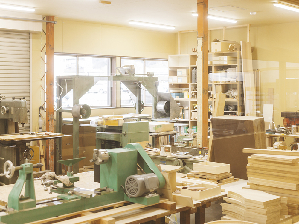 そうですね。訓練校では塗と蒔絵の研究生は1年しかかぶらないですし、弟子入りした人は環境によってさまざまですが、他の職人との交流はあまり多くありません。その点、シェア工房は木地、塗、蒔絵の工房がドア1枚を隔てて、横につながっています。自然と職人たちに交流が生まれ、ものづくりに新たな刺激が生まれるのではないかと期待しています。会津塗は完全分業制によって発展しましたが、このシェア工房によって1人でマルチタスクをこなせる職人が現れる可能性もありますね(笑)。たとえば木地師は、お椀などの丸いものを成形する「丸物師」と重箱などの四角いものを成形する「板物師」に分かれ、扱う機械や技術が全く異なります。シェア工房にはそれらの機械が一室にあるので、やる気があれば両方の技術をマスターすることが可能です。