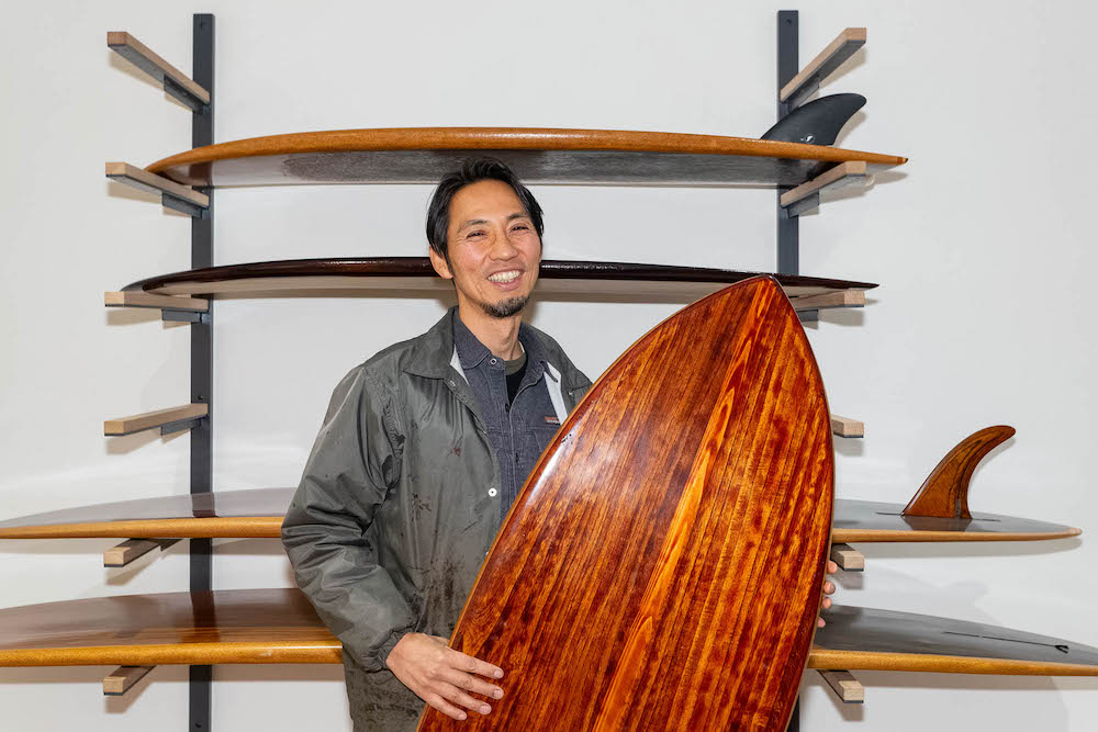 堤さん自ら漆塗りの木製サーフボード〈漆板Siita〉を3年愛用。「漆は酸やアルカリに強いため、海水への耐性はバッチリ。柔軟性が高く、ボードのしなりにも対応できます。撥水性が高いので、スピードが出やすいとプロサーファーにも好評です」