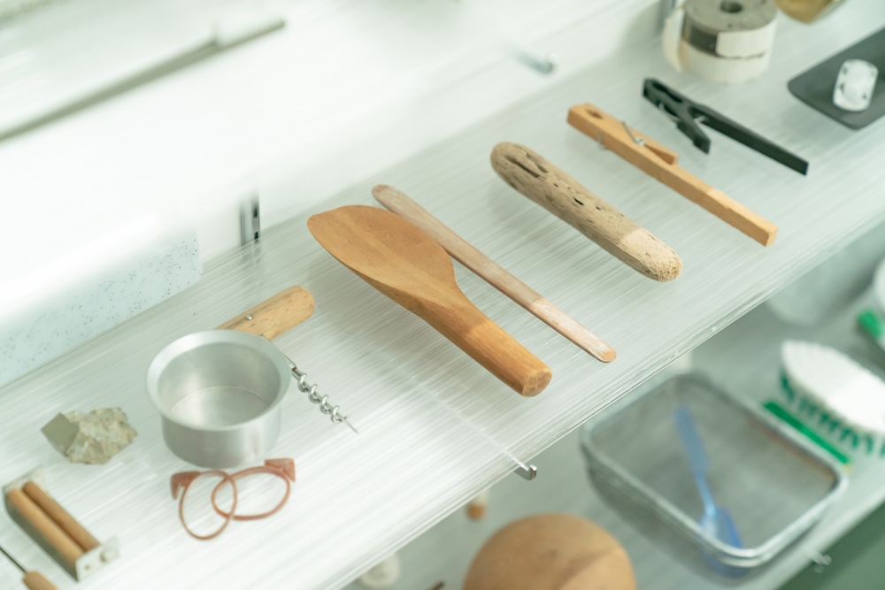例えば「手の延長になるもの」というテーマで「工具」や「ブラシ」だけを抜き取ってみる。「持ちやすいかたち」だったら、「しゃもじ」「流木」などを取り出して、どれが手に馴染むのか触りながら比較してみる。一見すると似ているけど、いい形というのはあるわけじゃないですか。こうした「ものの見方の訓練」をすることで、解像度が上がり、制作中の判断基準を持つことができる。自分がよく知っている領域・知らない領域関係なく、何かの役に立つかもしれないなと。
