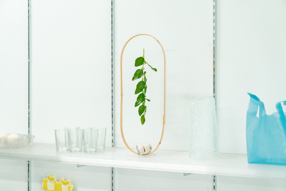 「ボタニカル・コンポジション」は、実際に竹を触りながら進めていきました。いろんなアプローチを試していると、たまたまオーバルの形がつくれたんですね。すると糸に薬草園の植物をかけられるようになった。もう少し展開ができるかもしれないと考えたときに、拾って集めていた石で竹を抑えるとオブジェのように自立するなと。そうして竹に石を置いて植物を吊る、自然のオブジェが完成しました。