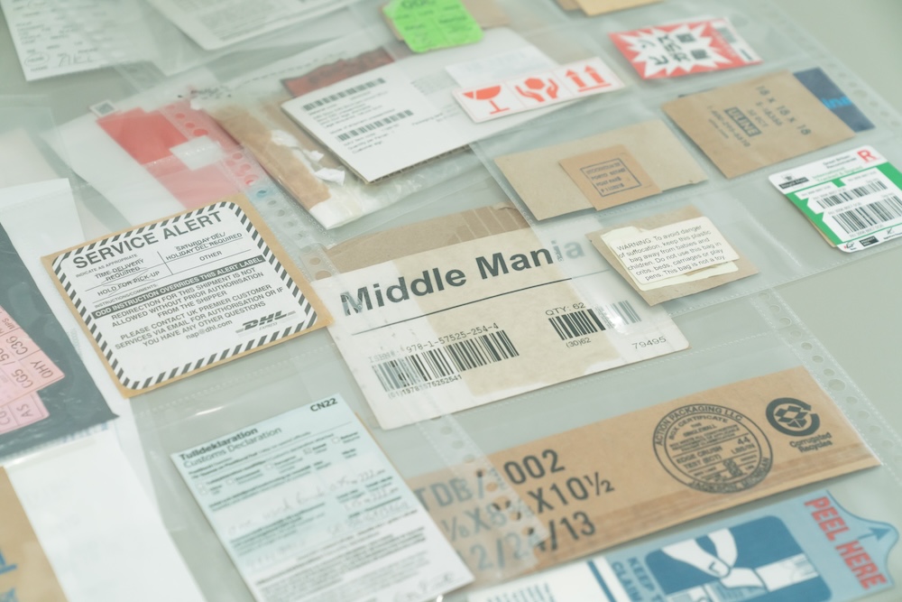 この話をいただいた時、考えるだけだと行き詰まるので、運送や梱包のシールだけを集めたオリジナルのスクラップブックを見ることにしたんです。そしたら何か発展させられそうだというソースを見つけて、ブラッシュアップさせていきました。