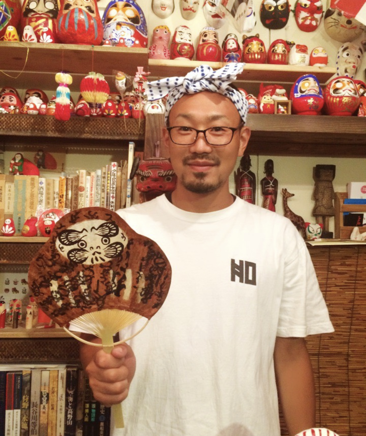大阪のエスニック雑貨店を経て、2015年に福岡に九州の民芸品と郷土玩具を紹介する店「山響屋」を開店。器をメインに取り扱いながら、店の一角で郷土玩具も販売する。開店1周年を過ぎた頃、郷土玩具にシフトチェンジ。今は、全国の郷土玩具を中心に店を営みつつ、だるま絵師としても活動する。