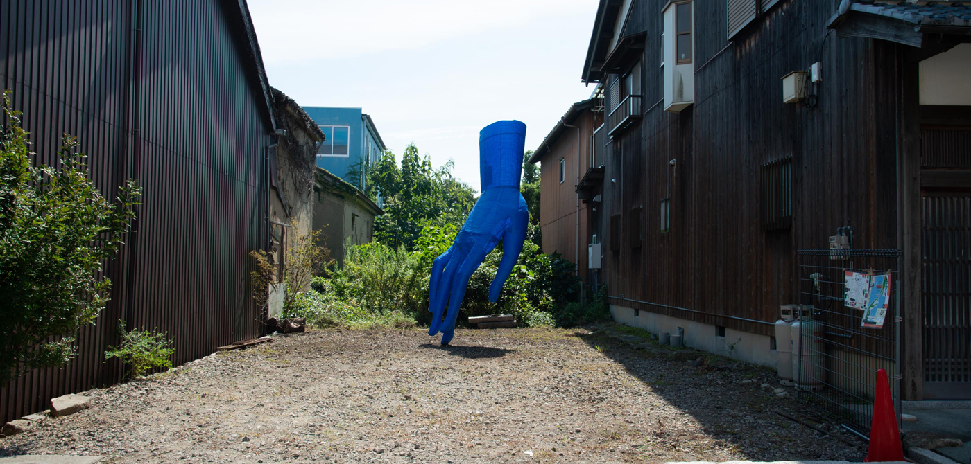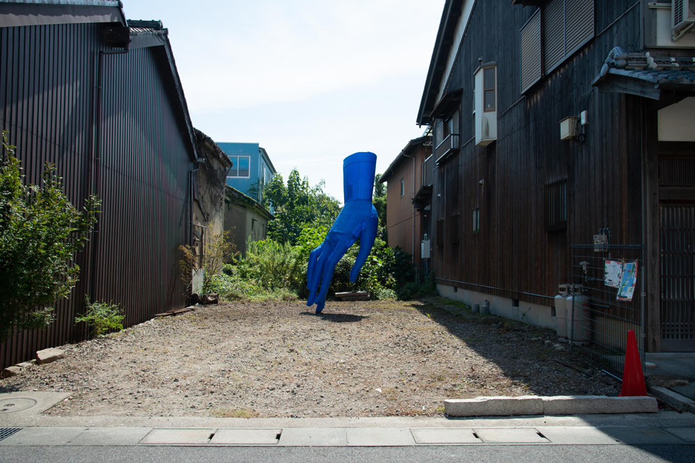 久保寛子さんの《やさしい手》。高さ4メートルの大きな手がブルーシートで覆われている。