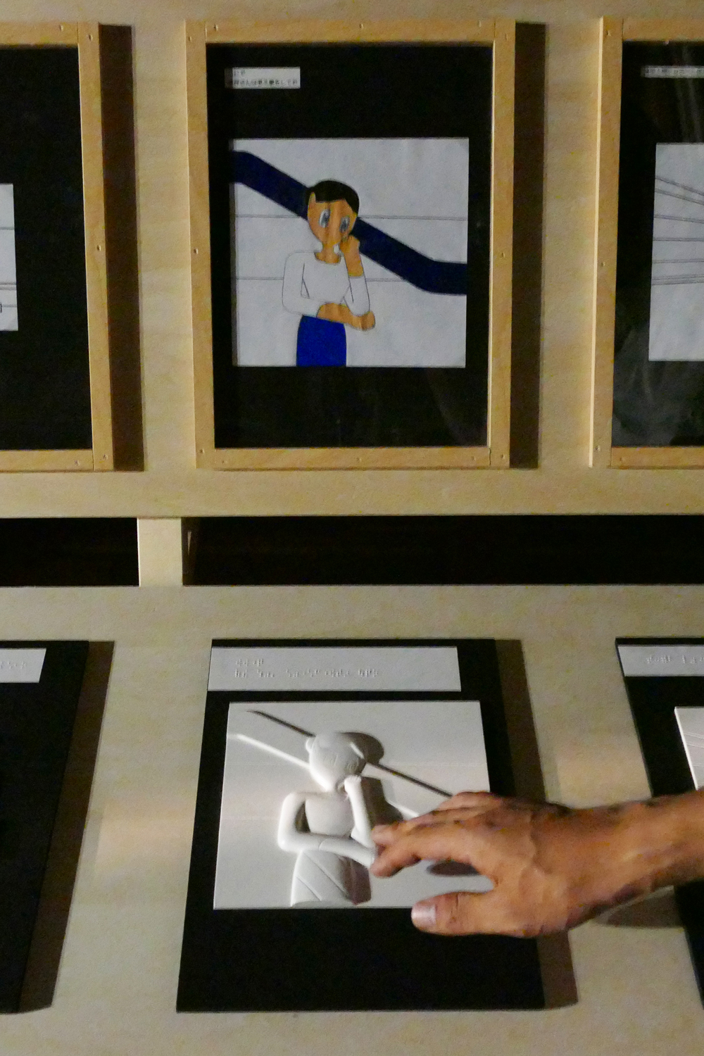 例えば、絵画をレリーフ化した、“触れる絵”。作者や専門家と相談し、何度も試作を重ねて製作しました。これによって、目が見えない人が触覚的に絵の世界観が体感できるようになっています。作品展示だけでない部分でも、何かおもしろいことができないかと常に考えています。例えば、音声ガイド。鑑賞体験がより豊かになればと、「美保さんガイド」というものを開発しました。美保さんというのは、東京在住の平野智之さんが描く「美保さんシリーズ」という作品に主人公として登場するキャラクターです。平野さんによる美保さんをモデルにして製作した人形を首にかけ、この人形の足を作品横に設置しているプレートにかざすと、音声ガイドが流れる仕組みになっています。それによって、あたかも美保さんと一緒に展覧会を巡っているような体感ができます。音声ガイドは情報保障のツールとして使用され、あくまでサポートのための装置という媒体ですが、美保さんガイドは、装置を使用すること自体に親しみが感じられ、鑑賞も能動的になります。視覚に障害のある方を意識して開発したのですが、障害のあるなしに関わらず、多くの人が楽しめるデバイスになりました。