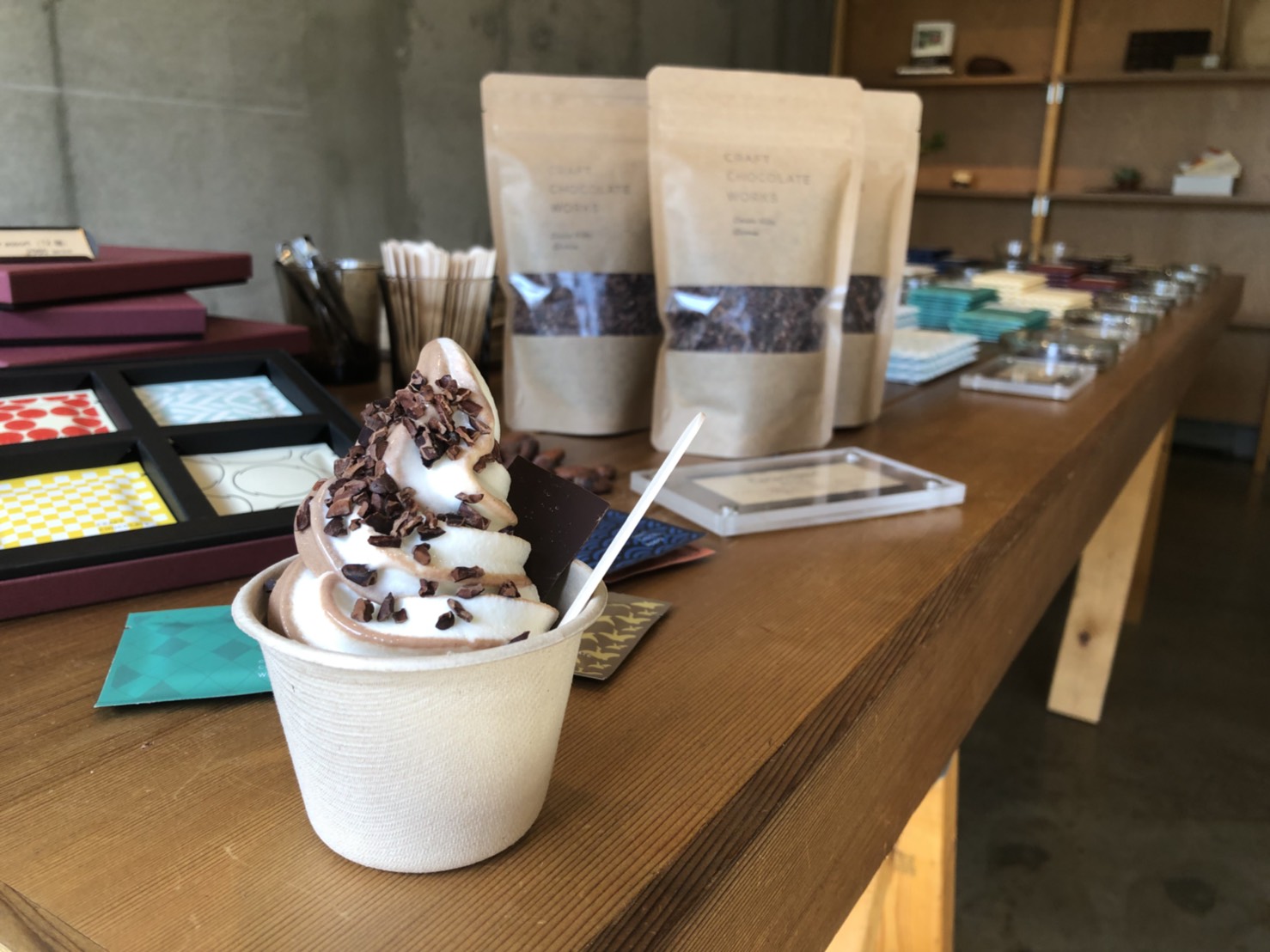 そしてこの時期人気なのがチョコレートを使ったソフトクリーム。贅沢にカカオニブをかけていただきました!