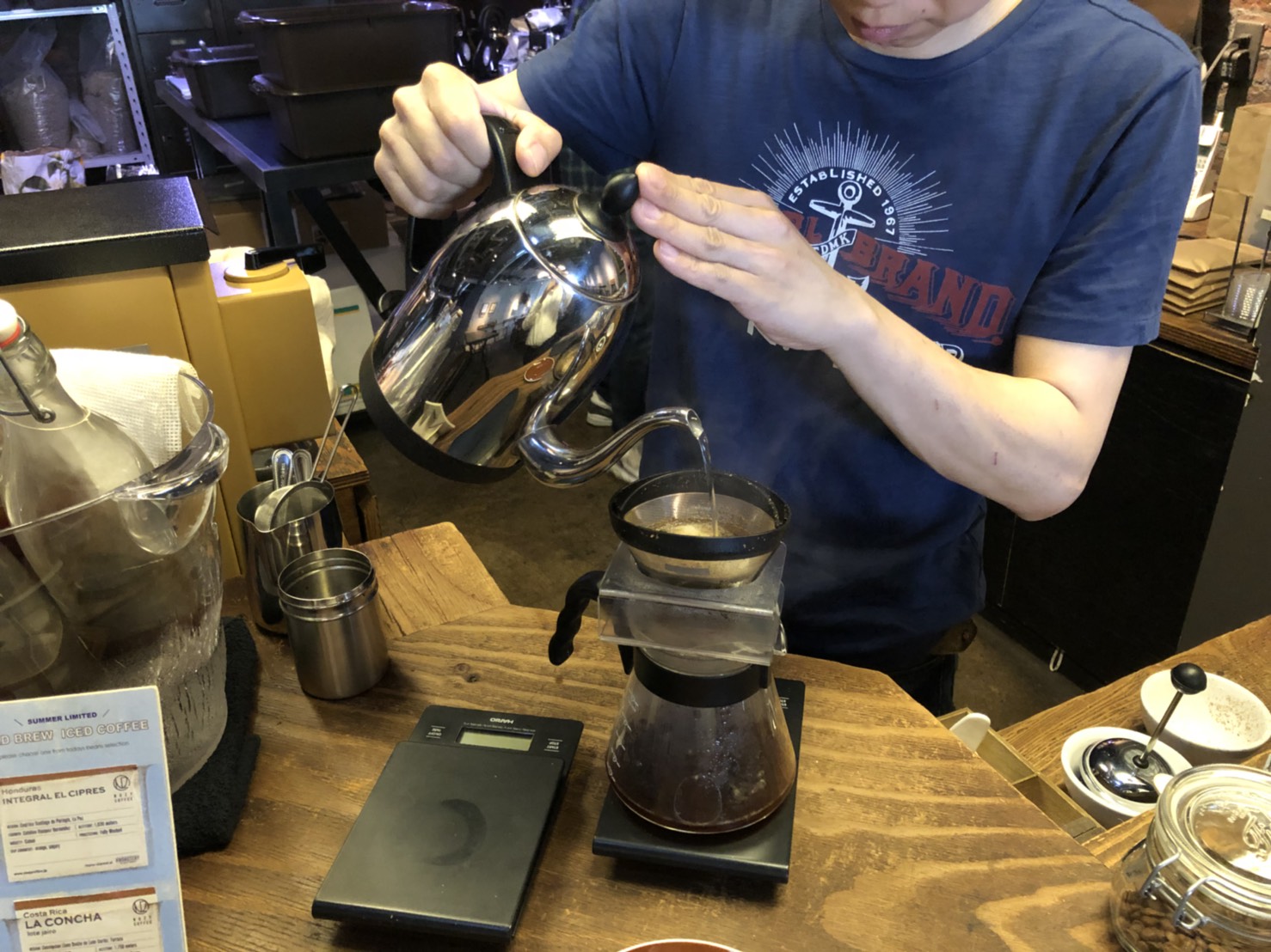 ここのところ猛暑が続いています。本日は水出しアイスコーヒーを。オリジンはHonduras LA BONITA。8時間かけてじっくり仕込んだその味わいは、オレンジやレモンピールを感じさせるすっきりと爽やかなテイストでした。THE ROASTERYではこの時期、常時3種類の水出しコーヒーを用意しているので飲み比べてみるのもオススメです!