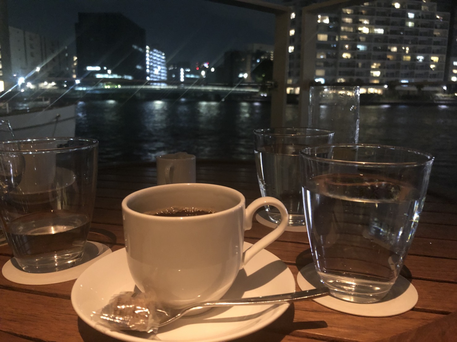 東京の夜景を見ながら水上ラウンジでフレンチプレスコーヒーを。夜風に当たりながらのコーヒーはとても贅沢です!@T.Y.HARBOR River Lounge