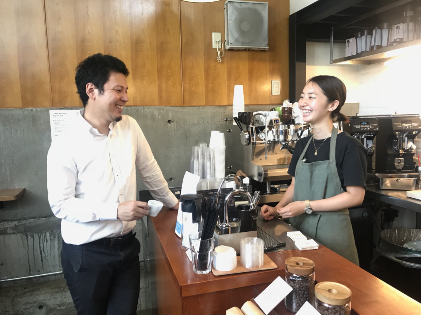三宿店アルバイトスタッフの名倉バリスタとの一コマ。美味しいエスプレッソを飲みながらの雑談も楽しい時間です。