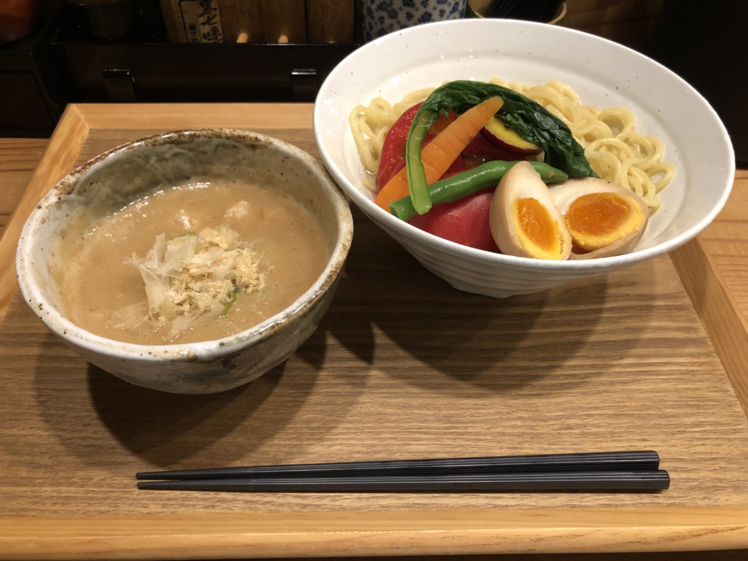 三宿のつけ麺屋「竹川」さんに。ここは山口県産の有機野菜がたっぷり入っていて、スープは濃厚な鶏白湯。麺もモチモチでとても美味です!