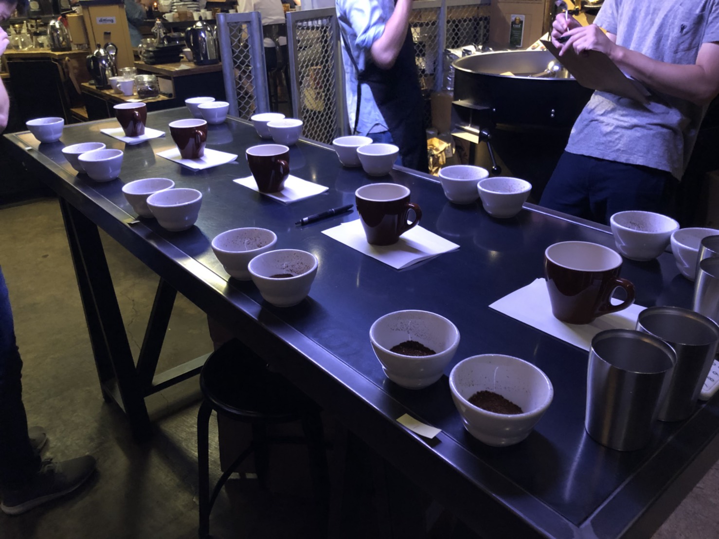 今日は社員複数名でカッピングトレーニング。銘柄が一切わからない状態で、コーヒーの美味しさを決める8項目を点数化します。このスキルはとても重要で、私たちのビジネスの根幹となっています。