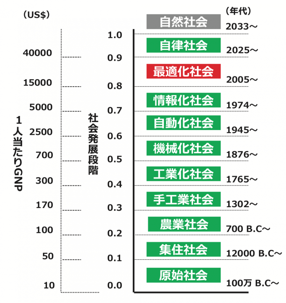 「この図は、立体にすると螺旋の一周分になります。原始社会から始まり、再びそこに戻るのではなく、一つ上の段階に上がるわけです。進化に必要な時間も次第に短縮化されていくという未来予測です。SINIC理論を発表した1970年は工業社会真っ只中で、自動化社会から情報化社会へ遷移しようとしている時代でした。そして、情報化社会が終わると、大きなパラダイムシフトが始まる、〈最適化社会〉がやってきます。現在はこの最適化社会の時代です」。(中間氏)