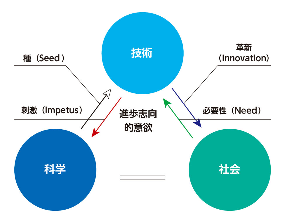 「〈SINIC理論〉の基本的な考え方は、このような図式で表されます。科学と技術、社会が相互に作用しながら発展していくというものです。社会が技術の必要性を求めて、技術が社会革新を起こします。科学は技術の種を与え、技術は科学に刺激を与えます。科学と社会も無関係ではなく、科学は社会に希望を与え、社会も科学に期待をする。これらが円環的に相互に作用して、社会は発展していきます」。