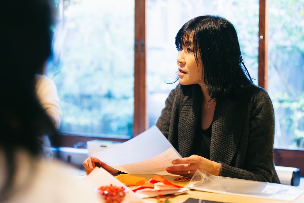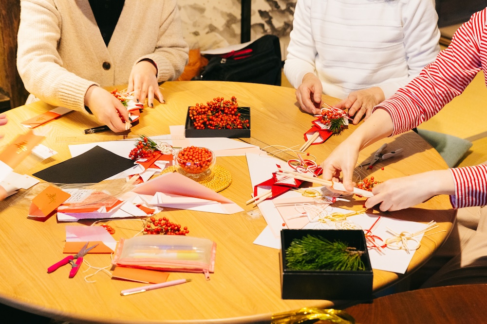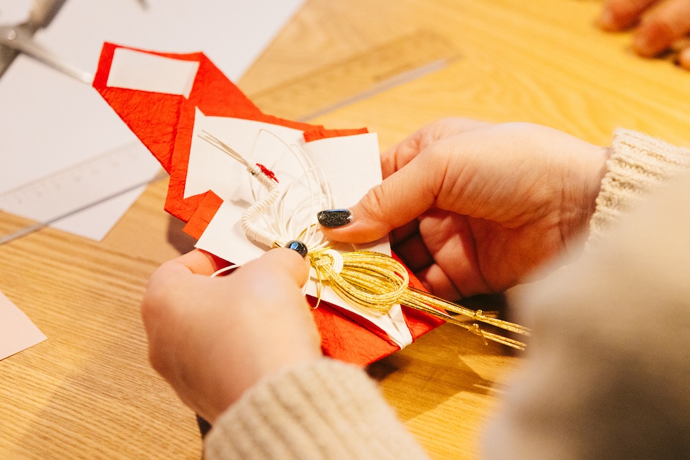 そして祝箸の箸袋を作るワークショップでは、中村さんが用意した和紙や千代紙、水引き、南天などが並べられ、一気にお正月らしい彩りに。「選ぶ紙の柄や質感、飾りによって、アイデアも広がりますよ」と中村さん。参加者の方々にアドバイスを重ねながら、オリジナル箸袋を作っていきました。
