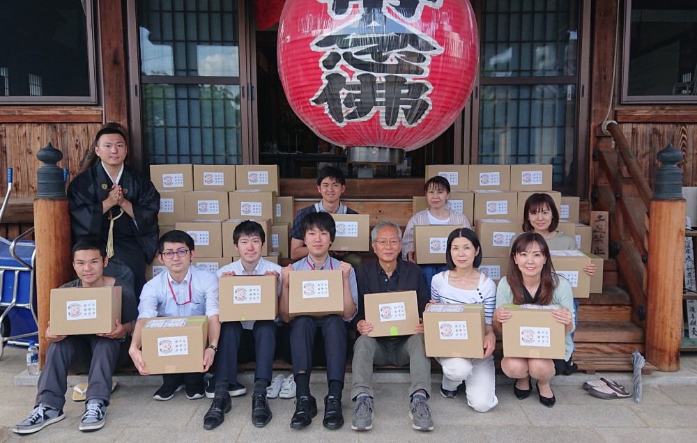 活動の理念に賛同した企業との提携も進んでいる。写真は提携企業の一つ、石井食品株式会社から『おそなえ』を受け取った時の様子。