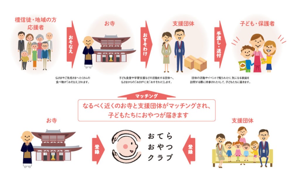 「おてらおやつクラブ」の支援の流れ。なるべく近距離のお寺と支援団体がマッチングすることで、より多くの子どもたちに“おすそわけ”が届く仕組みに。