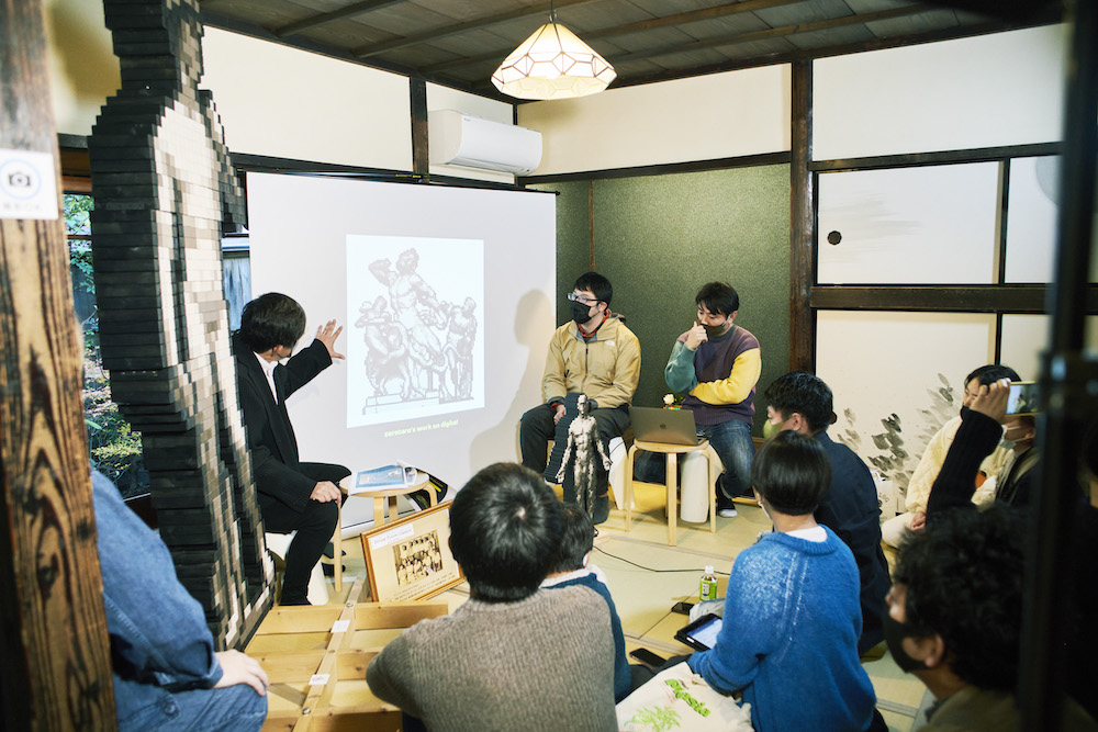 イベント当日は、未来定番研究所オフィスにてzerotaroさんの個展「Become Future Classic」も開催中でした(2021年12月18日で終了)。西洋の有名彫刻作品を、デジタルアート×木製彫刻で再現した作品や、狐面や灯篭を模したLEDで光る立体作品などを展示。イベント中も個展を見にきた方で賑わっていました。