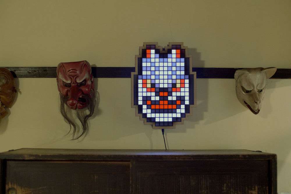 今回の個展のために制作された狐面。LEDで光って色が変わる。