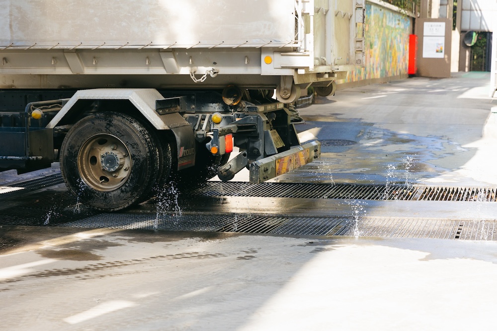プラント内の工夫は、廃棄物の再利用だけではありません。工場に出入りするトラックは、必ず出口でタイヤを洗浄しているそう。これも周辺地域を汚さないための環境に配慮した取り組みです。