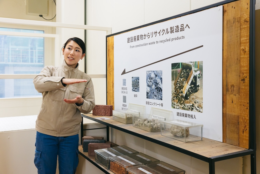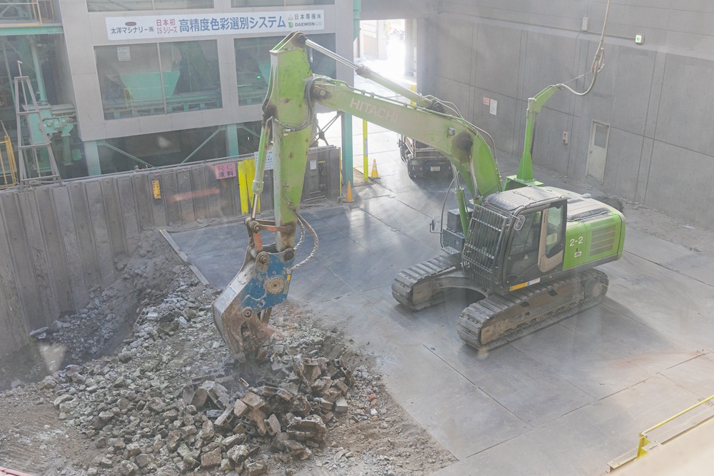 まず案内されたのは、「廃コンクリート再資源化プラント」。ここでは、重機を使って建設廃棄物の鉄筋コンクリートを粉砕していました。日立グループと共同開発した電動式油圧ショベルを導入していて、旧来のエンジン式のものから約70%のCO2削減が見込めるそうです。ここで粉砕されたものは、再生砕石や再生砂になり、道路の路盤材や路上整地材として再利用されるとのこと。