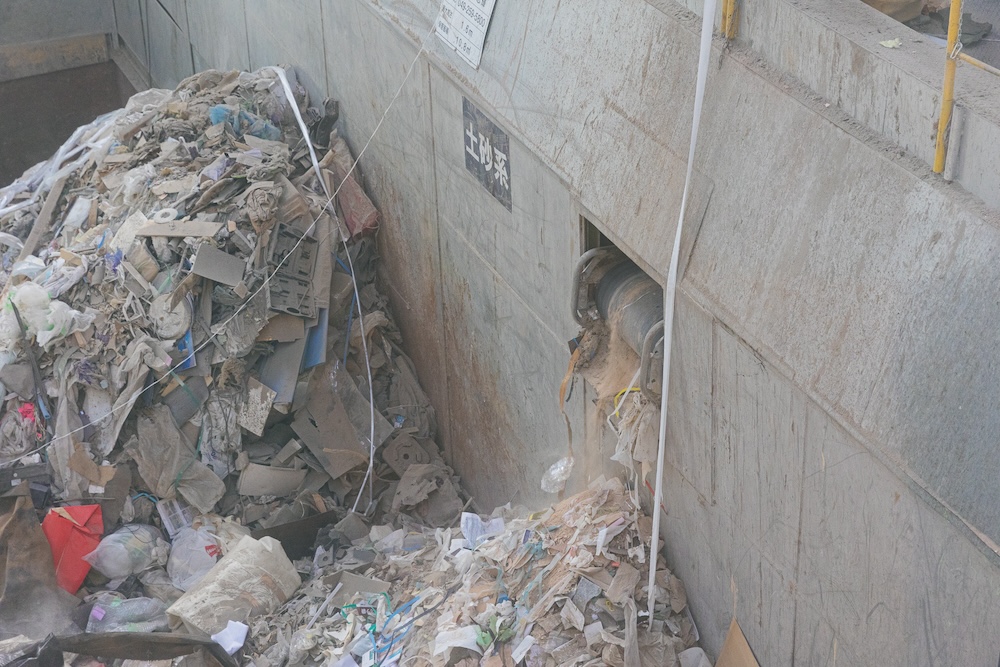 「廃プラスチック類再資源化プラント」では、トラックで運ばれてきた廃棄物を粗選別し、再資源化へと展開。廃プラスチックや古紙はRPFと呼ばれる固形燃料へとリサイクルされます。