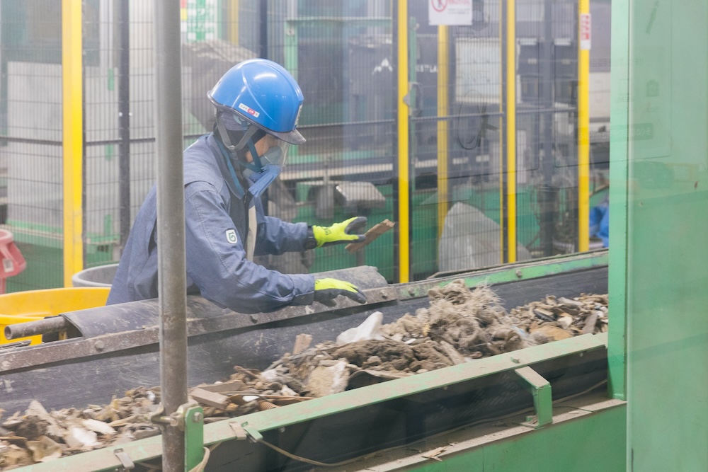 再資源化の過程には、人の手による選別が不可欠なのだそう。混ざり合った廃棄物を素材ごとに目にも止まらぬ速さで振り分けていきます。