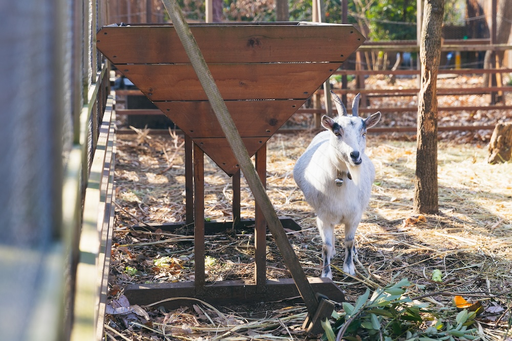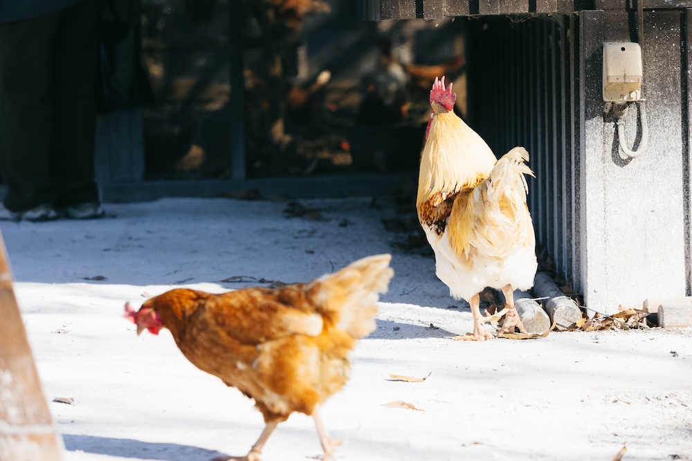 エントランスをくぐると待っていたのは、立派な鶏のいる「ポートリーガーデン」。自社のレストランで出る野菜の切れ端などを食べて育ち、採れた卵はレストランで提供するプリンなどに使われるそう。