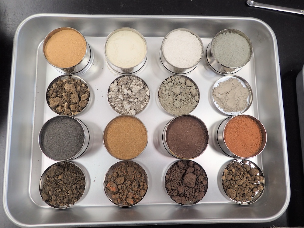 岩石の粉末など8種類の試料(1段目と3段目)を、40年間山中に埋めると土に近い状態(2段目と4段目)になる。(提供:藤井一至)