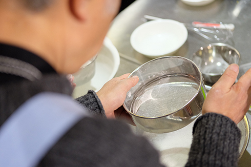 たくさんの材料を0.1g単位で計量、バターは60℃ぐらいに溶かす、など様々な技術や工程を細かく学ぶ