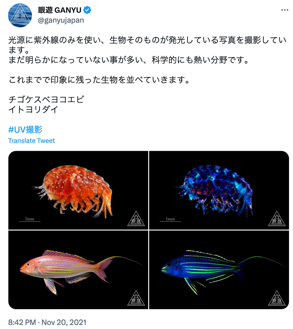 3人目は、眼遊さん。サイエンスやテクノロジーこそよっぽど現代アートだなと思わされることが日常のなかで少なくないのですが、眼遊さんの作品はまさにそれだなと。光源に紫外線を使って生物を撮っている方です。