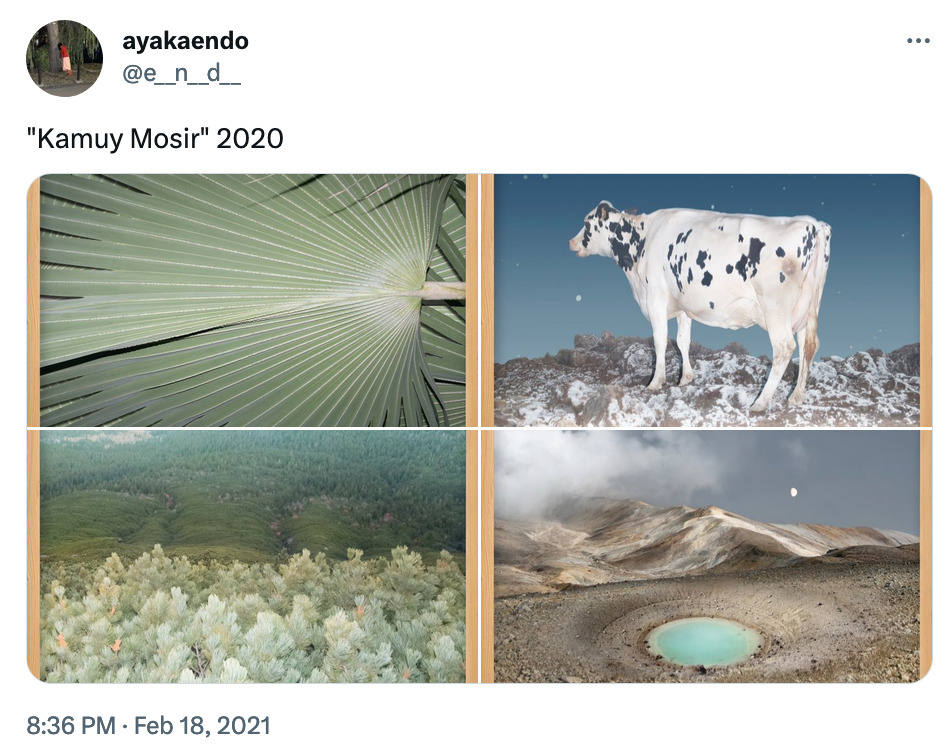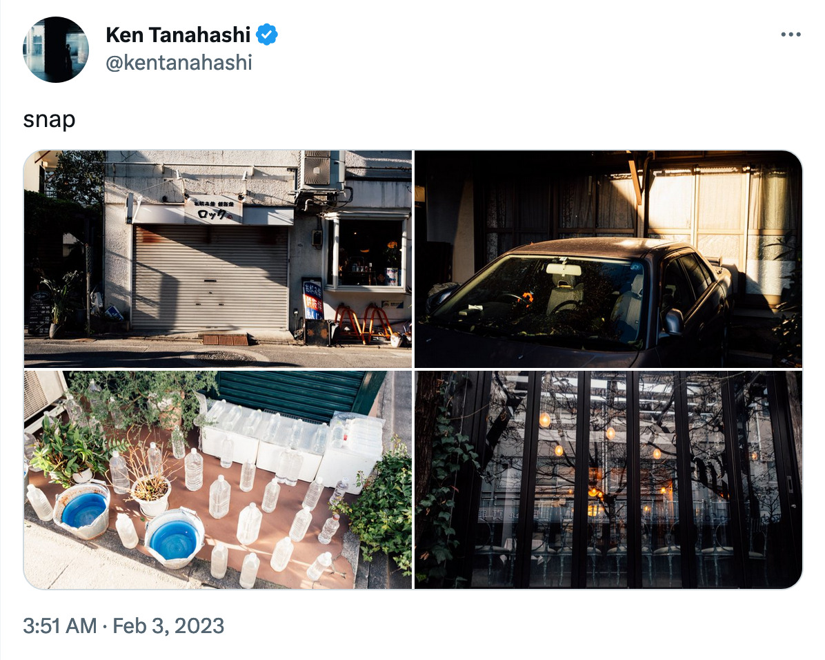 Twitterの1投稿における写真表示は最大4枚ですが、上のようにサムネイルがグリッド状に表示されますよね。Kenさんを筆頭としたSNS写真家たちは、1枚1枚になにが写っているかという細部よりもまず、4枚がサムネイルで並んだときに浮かび上がる幾何学的なバランスや構図を計算しているのでしょう。いかに大きく印象的に見せるかが問われがちな従来の物質的なプリントとしての写真とは真逆に、小さなサムネイルで鑑賞されるSNSならではの着眼点で、とても面白いと感じます。