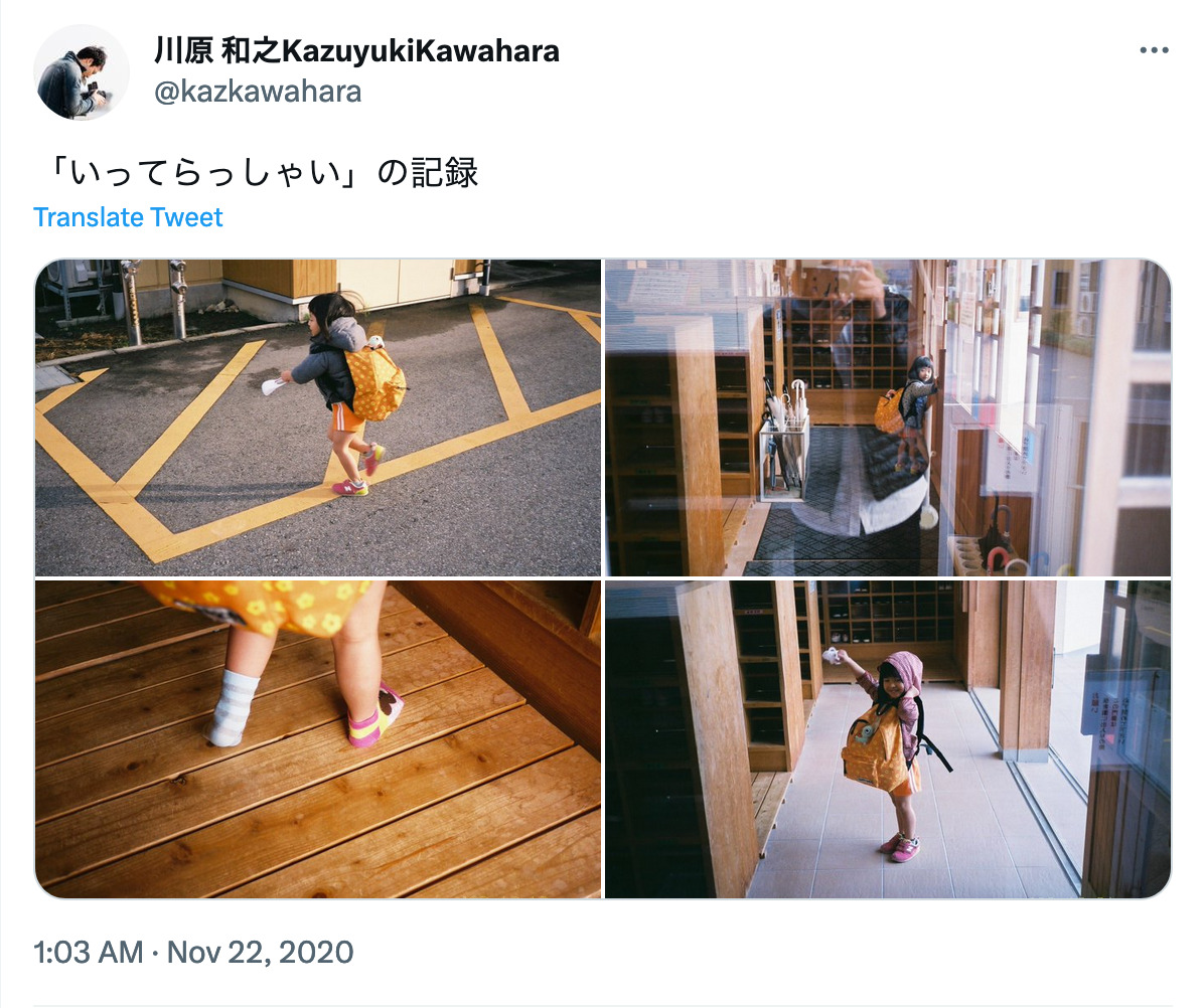 例えば「いってらっしゃいの記録」という投稿では、自身のお子さんを学校まで送る場面の繰り返しを見せている。ガラス越しに撮ることで、撮影対象の子どもの姿はもちろん、ガラスに反射して映る川原さんの姿も写り込んでいますよね。一枚の写真のなかで、親子の別れ際の重なり合いとその切なさが視覚的によく表されている。そこまで考えずになんとなく眺めても、感覚的にそうしたことが捉えられる写真ならではの面白さがふんだんで。だからカズさんの家族写真は多くの反応を得ているんじゃないかと思います。
