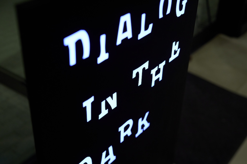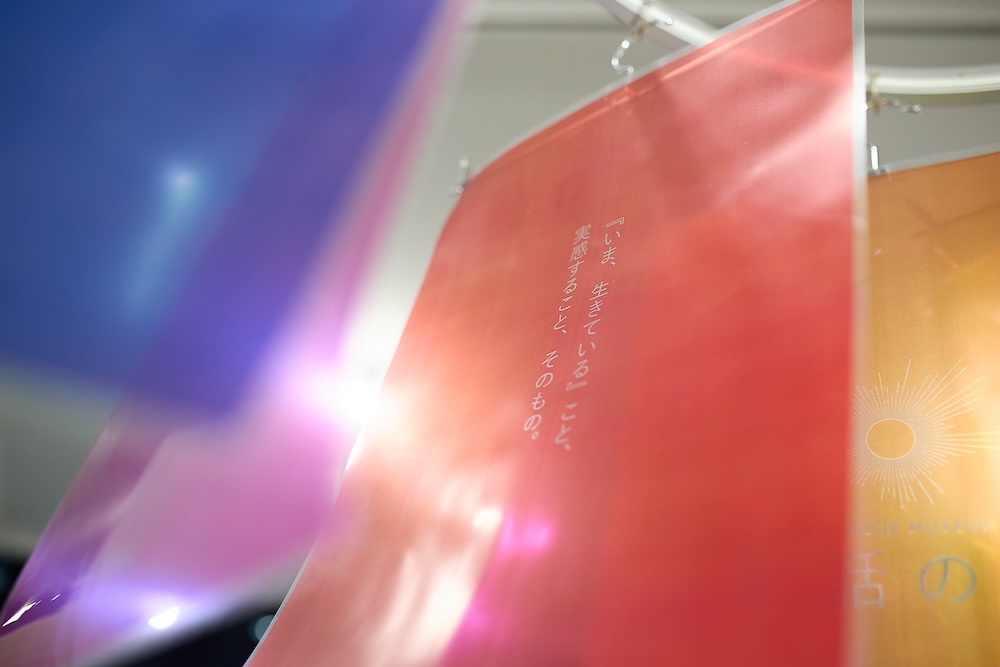今回編集部員たちが体験するのは、暗闇の中で懐かしい電車の車両「キハ40」に乗って旅をする〈ダイアログ・イン・ザ・ダーク〉のプログラム。スタートまでの間、会場のエントランスを回遊していると、天井から吊り下げられたカラフルな紙に目が留まります。