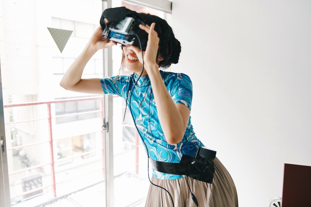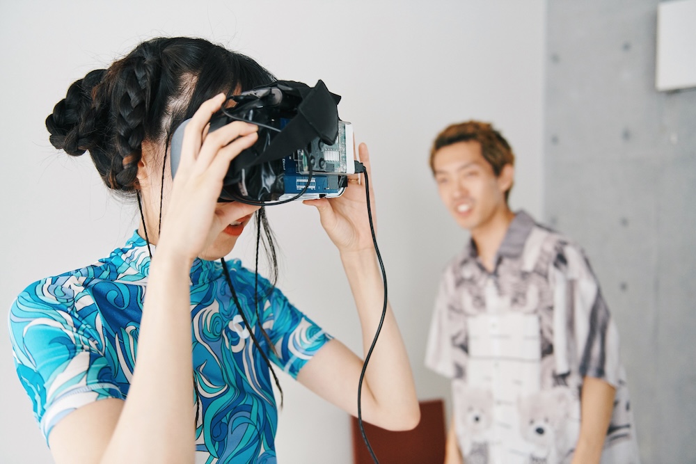 「わっ、平衡感覚がなくなって普通には動けないですね。体が落ちていくような感じもして……」と草野絵美さんが体験しているのは、花形槙さんの作品《still human》。まずは、花形さんにどんな作品なのか聞いてみることに。