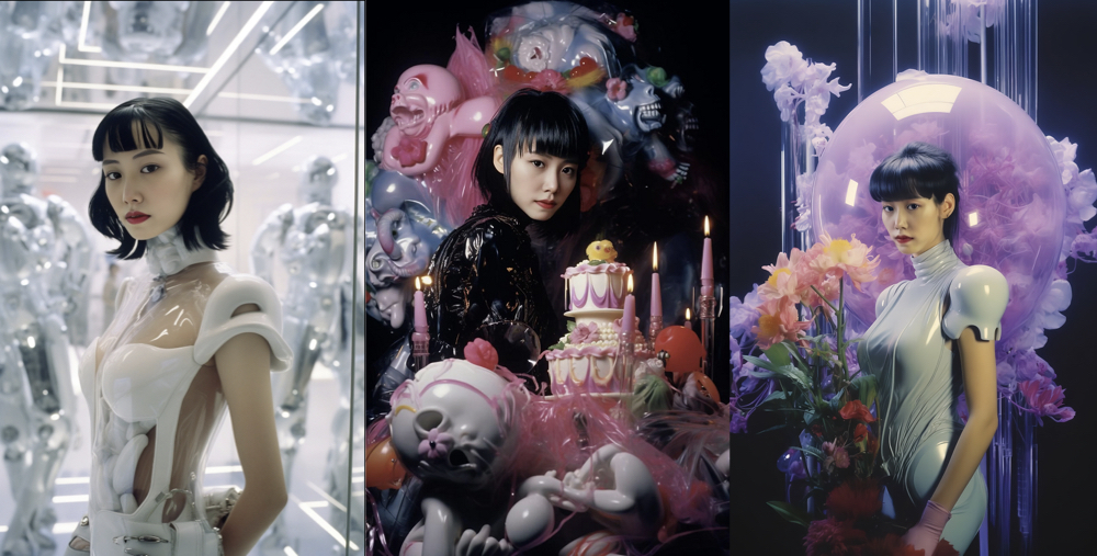 例えば、「原宿」、「日本の公園の風景」、「80年代の日本」といった言葉を検索するとある程度画像が出てきます。どちらかというとアメリカを踏襲した80年代のアジア系の人といったイメージではありますが。でも例えば「竹の子族」と検索すると、そもそも学習元にあまり存在していないためか画質のいい画像はほとんど出てこない。そこで、「サテンの着物みたいなオールインワンを着ていて、グラムロック風のメイク」というように、竹の子族について言語化するために、今度はChatGPTなどに相談するんです。そのプロセスは会話しているような感じで面白いですよ。
