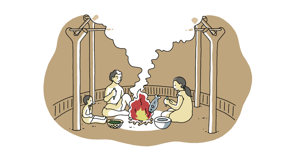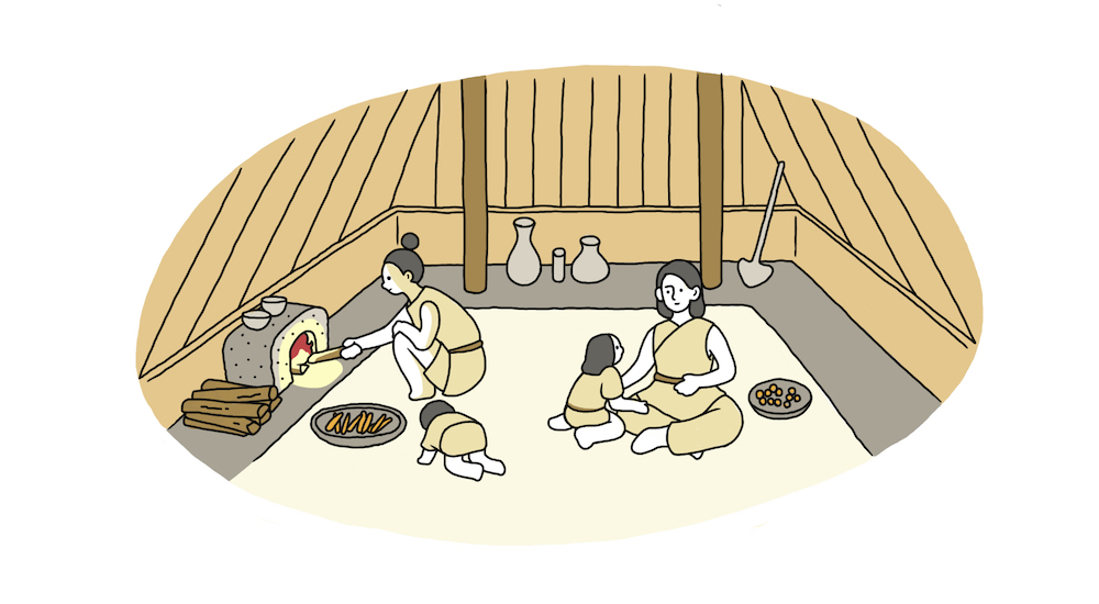 およそ1万1千年前から7千年前の縄文時代早期になると徐々に人間たちが定住をはじめ、常に焚き火がある生活になっていきます。つまり、竪穴建物が作られるようになり、その建物の真ん中に「炉」という常設の焚き火ができる場所ができました。この火は、建物の中の灯でもあり、暖もとれる、調理もできると非常にマルチな役割を果たします。