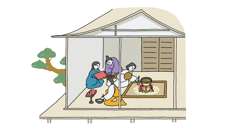 平安時代の終わり頃から、鎌倉時代以降、家の端にあった火が中心に復活してきます。それは「いろり」が登場したから。こちらもいつ誕生したのか、正確にはわかりませんが板の間が普及してからのこと。端に移動していた火が、生活の真ん中に戻ってきました。いろりで暖をとったり、お湯を沸かしたり。コミュニケーションの場所としても機能していたのでしょう。